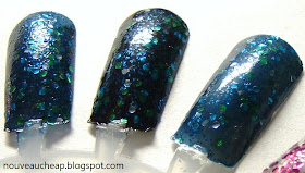 I did this manicure QUICKLY so excuse the messiness. I just had to show you what ONE COAT of this polish looks like over a white creme. See all of that navy blue jelly? The glitter in this one looks like a jelly sandwich, after just ONE coat on top of white!